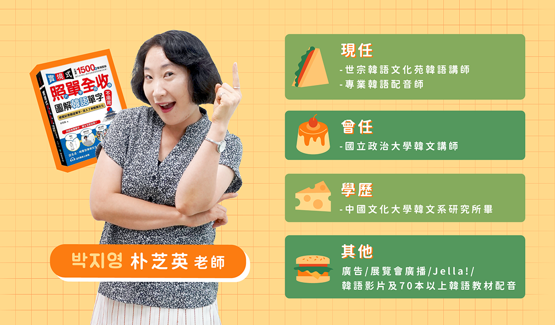 朴老師來臺灣多年,不但有豐富的教學經驗,更深知臺灣學習者在學習韓語發音時容易產生的難題,透過老師活潑又有趣的上課風格,讓您用輕鬆愉快的心情學習最標準的韓語發音。想學習有趣的韓語發音課程,找朴芝英老師就對了!