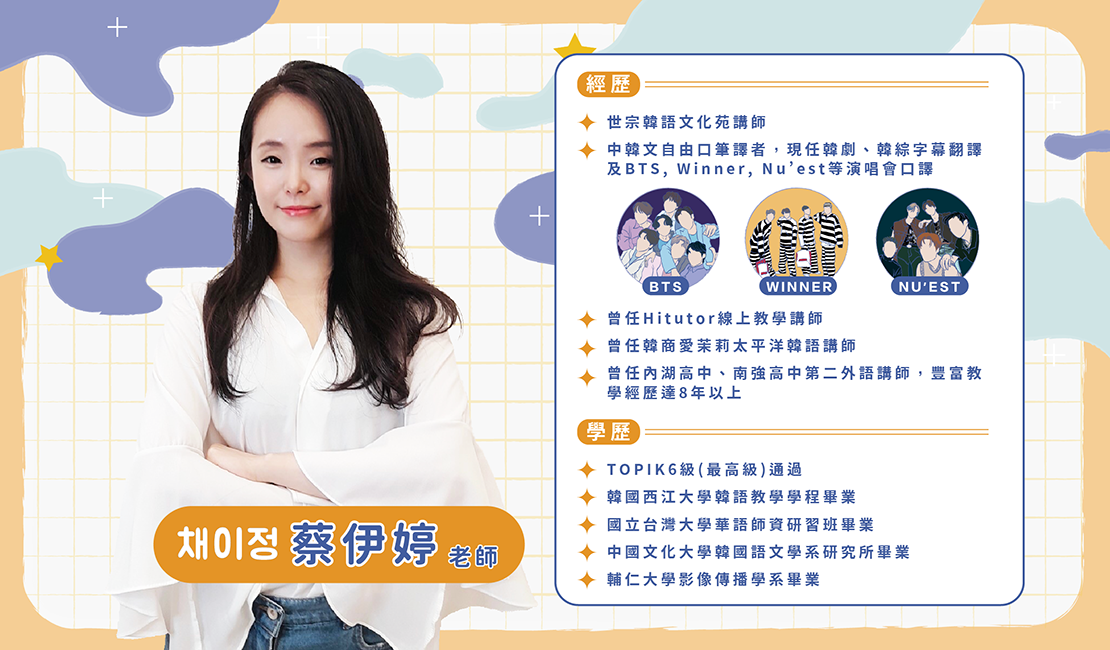 目前連續上了四學期蔡老師的課, 從韓語零基礎到現在認識了基礎韓語句型以及生活會話, 個人本來只是因為工作輔助所以嘗試接觸韓語且平常不看韓綜跟韓劇, 但因為上了蔡老師的課逐漸對韓語產生更高興趣, 也開始看韓劇聽韓語歌, 很感謝蔡老師這半年來循序漸進的課程引導且也很有耐心聽學生遇到的問題給予適當建議, 個人非常推薦蔡老師的課